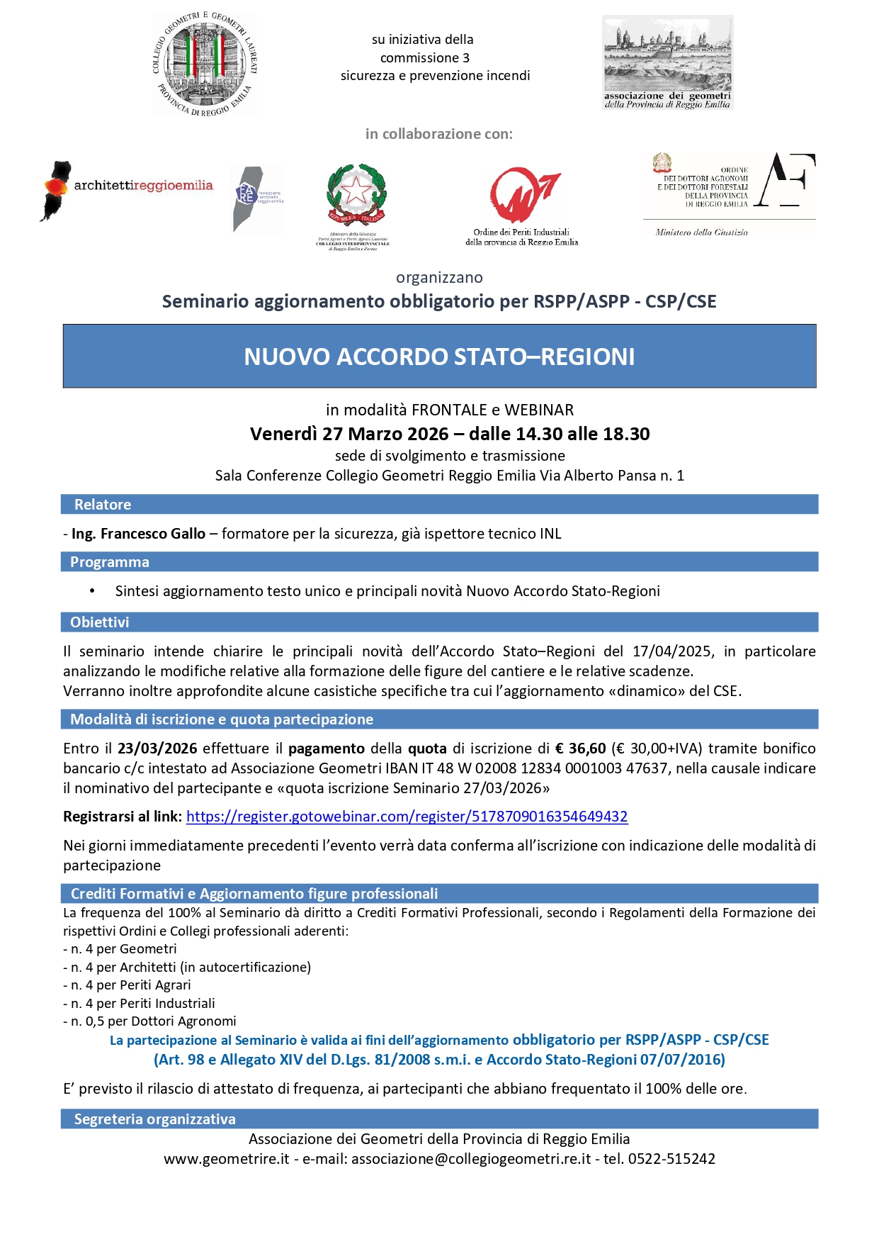 Entro il 23/03/2026 effettuare il pagamento della quota di iscrizione di € 36,60 (€ 30,00+IVA) tramite bonifico bancario c/c intestato ad Associazione Geometri IBAN IT 48 W 02008 12834 0001003 47637, nella causale indicare